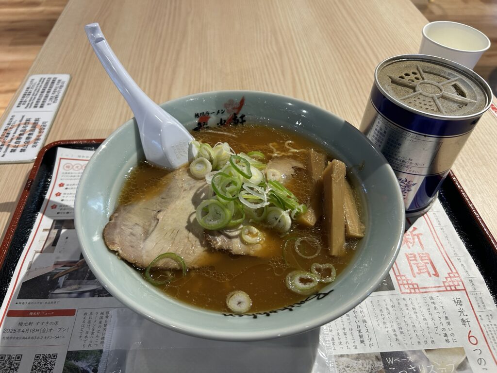 予想はしていたことなのだが、やはり気温はそれなりに低く、半袖のシャツ1枚ではやや肌寒い。しかし、この肌寒さが懐かしくもある。旭川空港の国内線ターミナルビル2Fにある梅光軒で旭川醤油ラーメンを注文したのだが、これも昨年とまったく同じ行動である。旭川空港限定の焼きとうきびバターがトッピングされたメニューなどもあるのだが、やはりシンプルな醤油ラーメンである。
